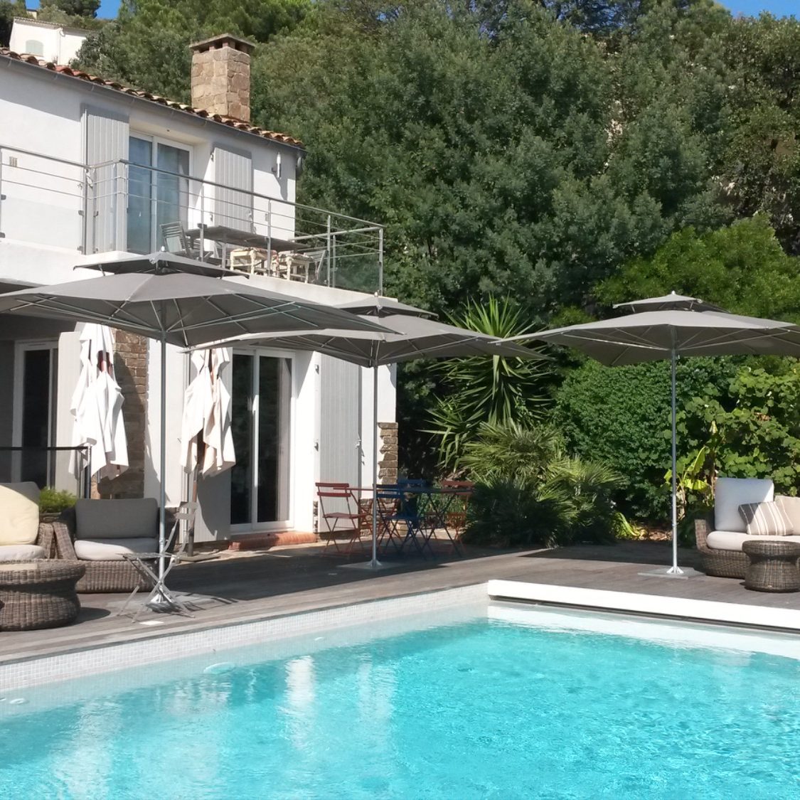 Nous avons accompagné le Domaine de la Rose de Lancôme dans la réalisation de parasols sur mesure, pensés pour s’intégrer harmonieusement à l’architecture du lieu.