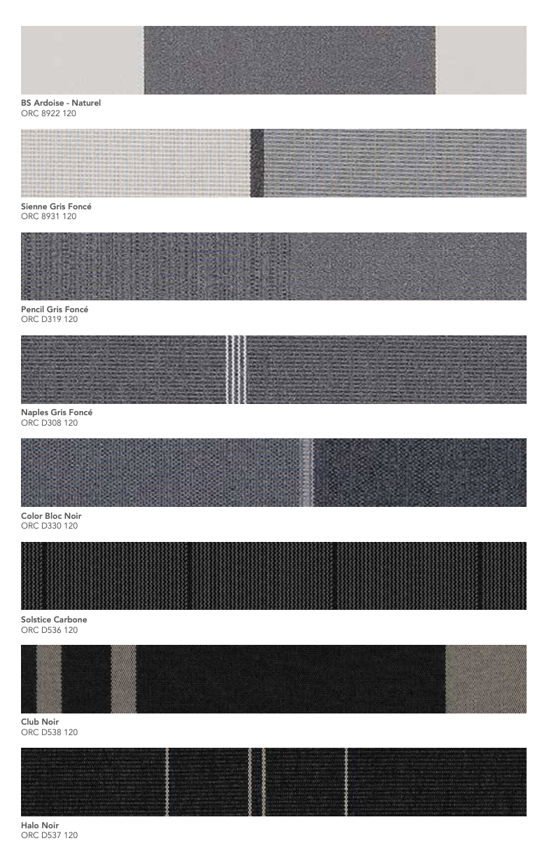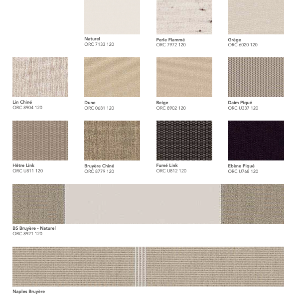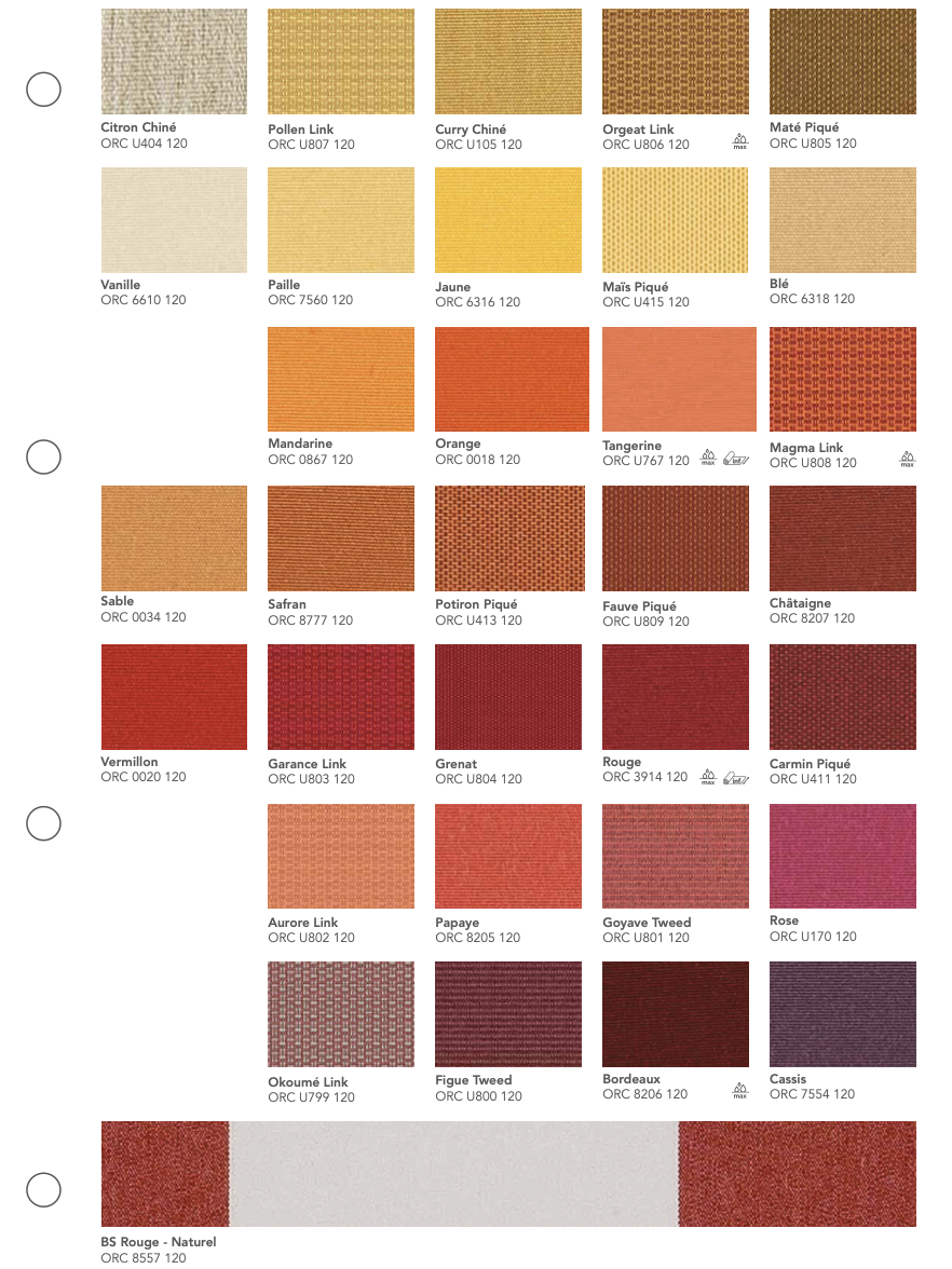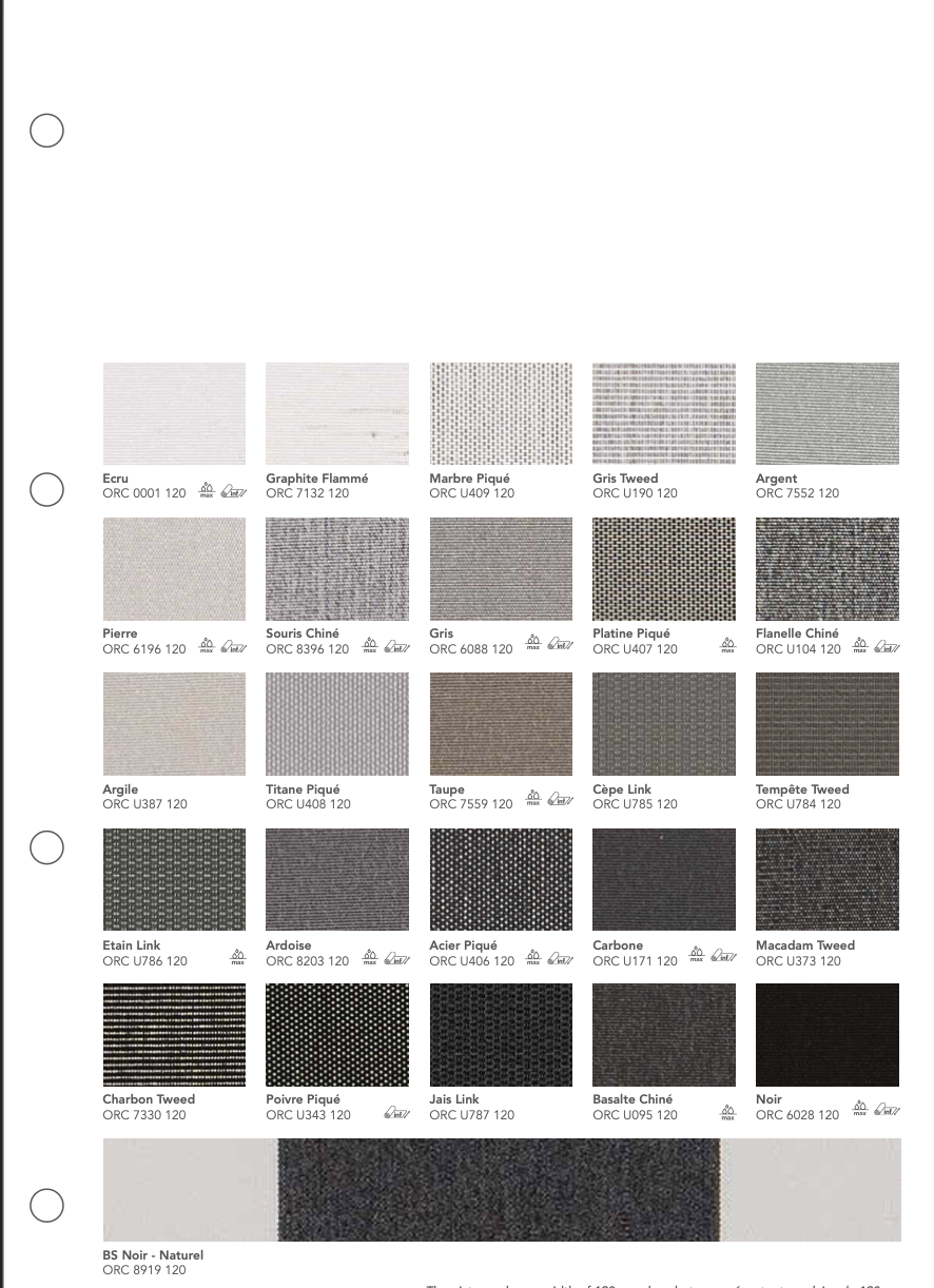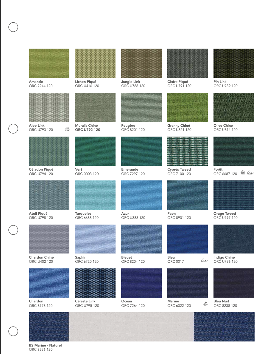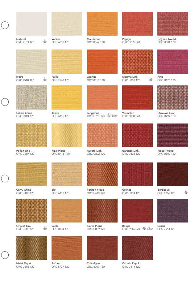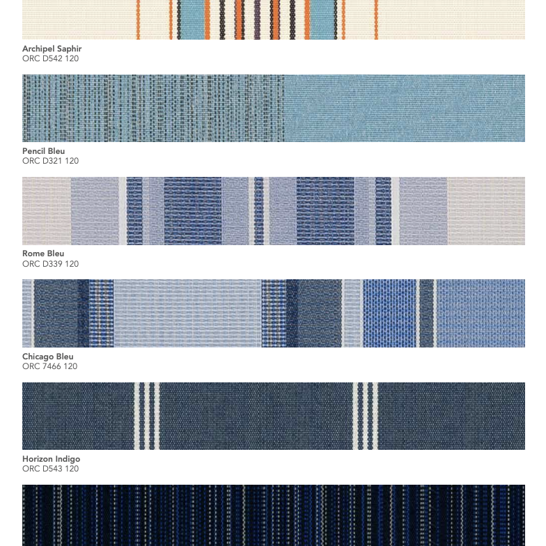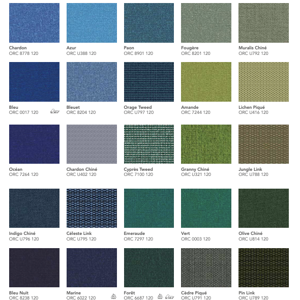 La gamme Orchestra® de Dickson est une toile acrylique teint masse reconnue pour sa résistance aux UV, aux intempéries et à la décoloration. Conçue pour un usage extérieur durable, elle garantit une excellente protection solaire et une tenue des couleurs exceptionnelle dans le temps.